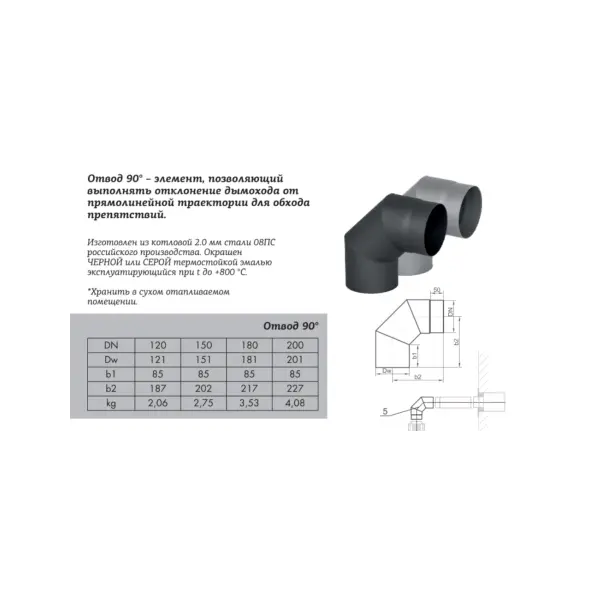 Материал изготовления - сталь марки 08ПС толщиной 2 мм, окрашенная в черный или серый цвет. Рабочая температура до 800°С. Сборка элементов между собой производится по конденсату без хомутов - через раструбное соединение, которое является плотным благодаря уникальным посадочным размерам изделий.