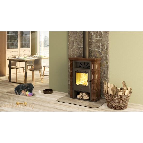 • Высокая эффективность: Оснащена системой длительного горения и чистого горения (вторичный дожиг газов), что обеспечивает КПД до ~80% и экономичный расход дров.